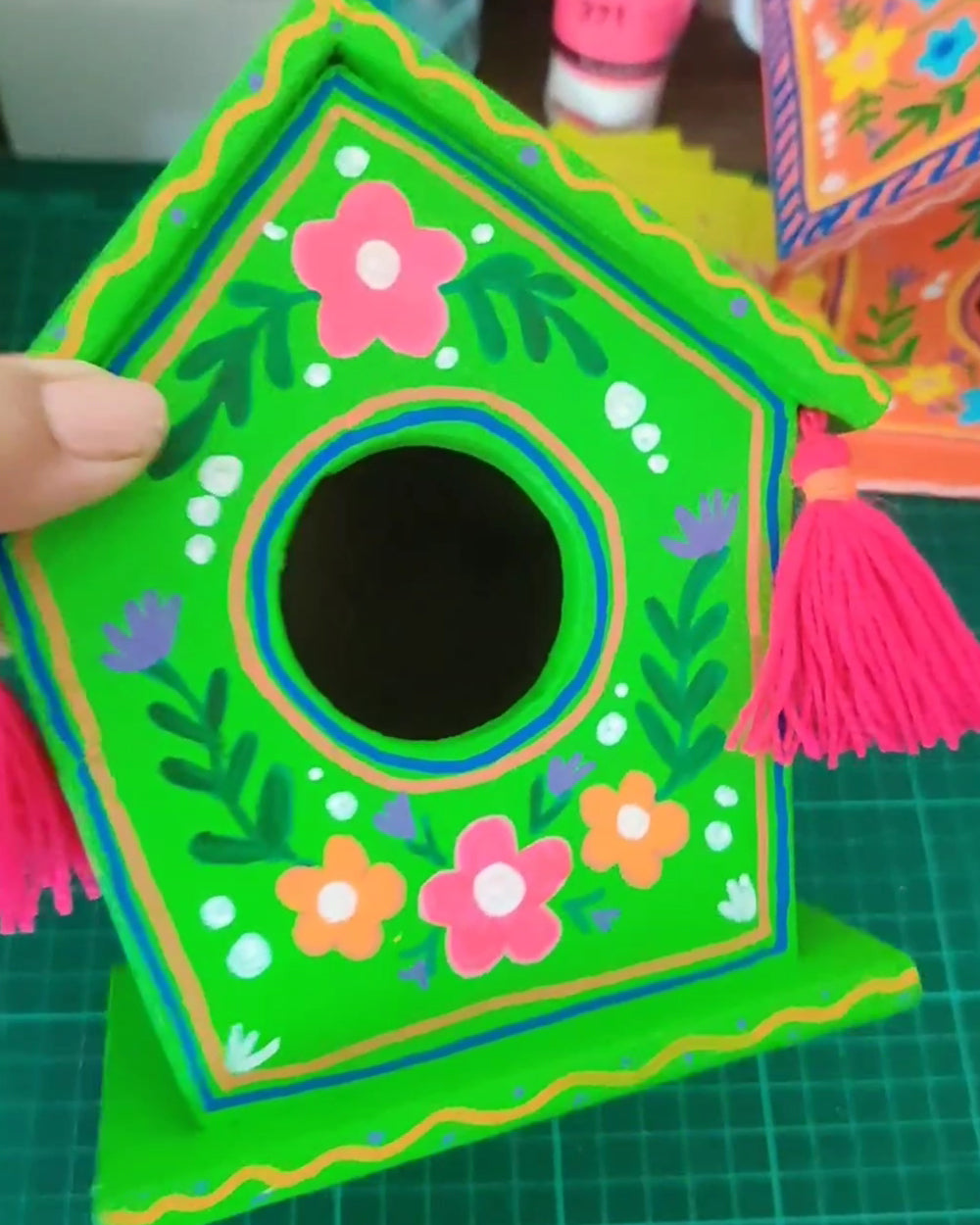 Our adorable wooden birdhouses, bursting with playful colors and cozy charm to delight your feathered friends!